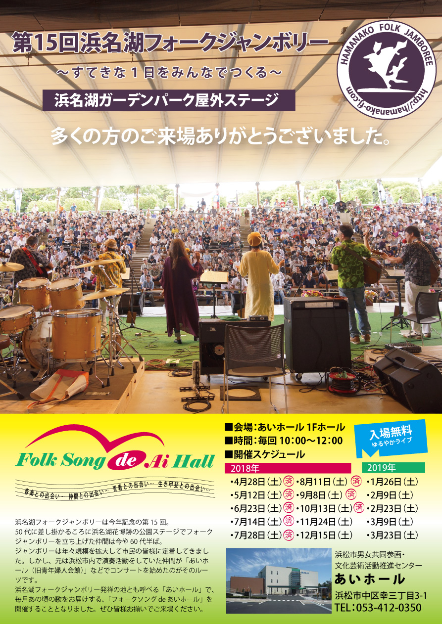 ウラは、第15回浜名湖フォークジャンボリーのお礼と、4月から始まった「フォークソング de あいホール」のご案内です。
